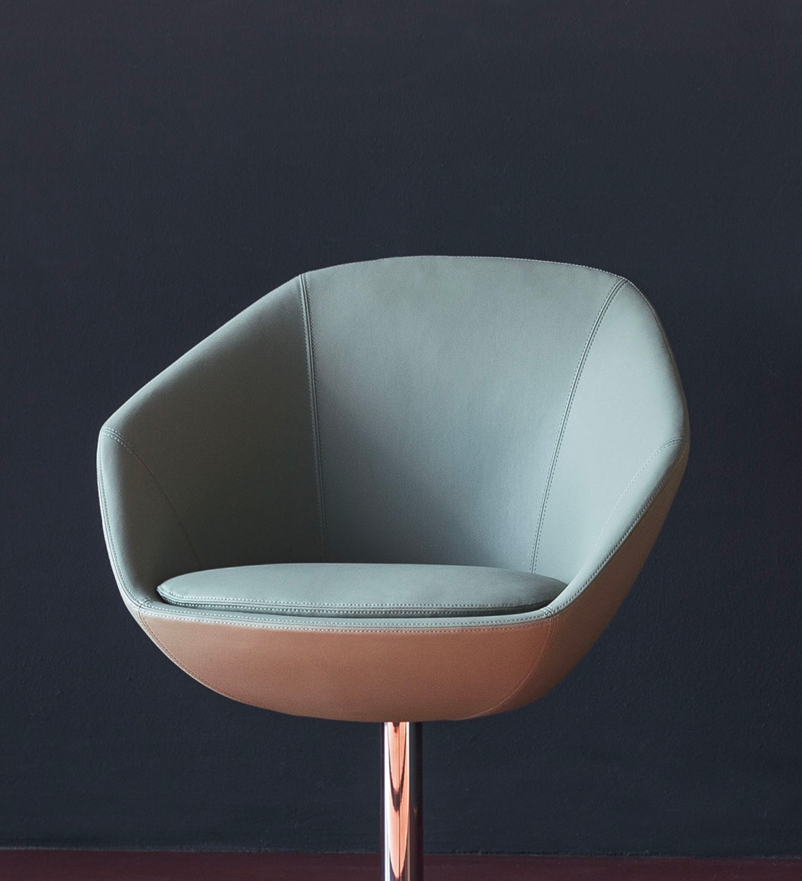 An ergonomical shape drawn from nature embraces the body while enhancing the decor, in all its multiple forms that can satisfy any requirement, also available as a sofa. The upholstered shell of Fleur, like the calyx of a flower, can be combined with numerous different metal structures, fixed or swivelling, to fit into any setting: from domestic to contract to offices, as well as waiting rooms or hotel foyers.