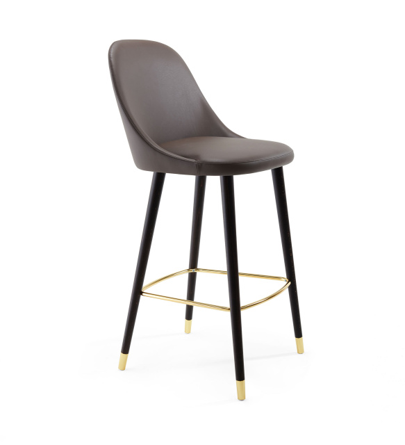Plywood shell upholstered in a wide range of materials. Legs in solid beech wood, connected to the shell by a strong hidden metal structure. Brass anodized ferrules and footrest ring.