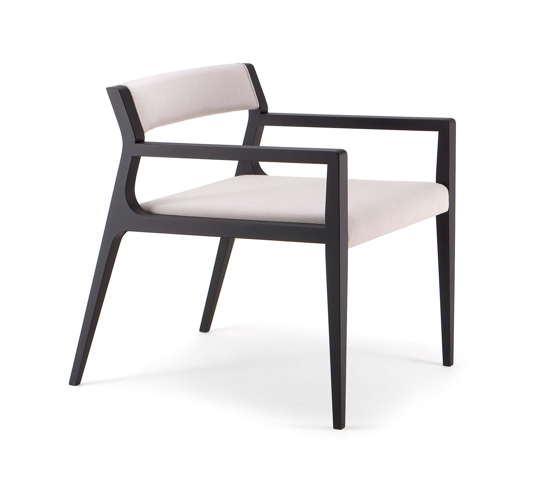 Poltroncina con struttura in faggio massello. Il rivestimento di sedile e schienale è disponibile in tessuto o pelle, in tutta la gamma di colori, finiture e rivestimenti.