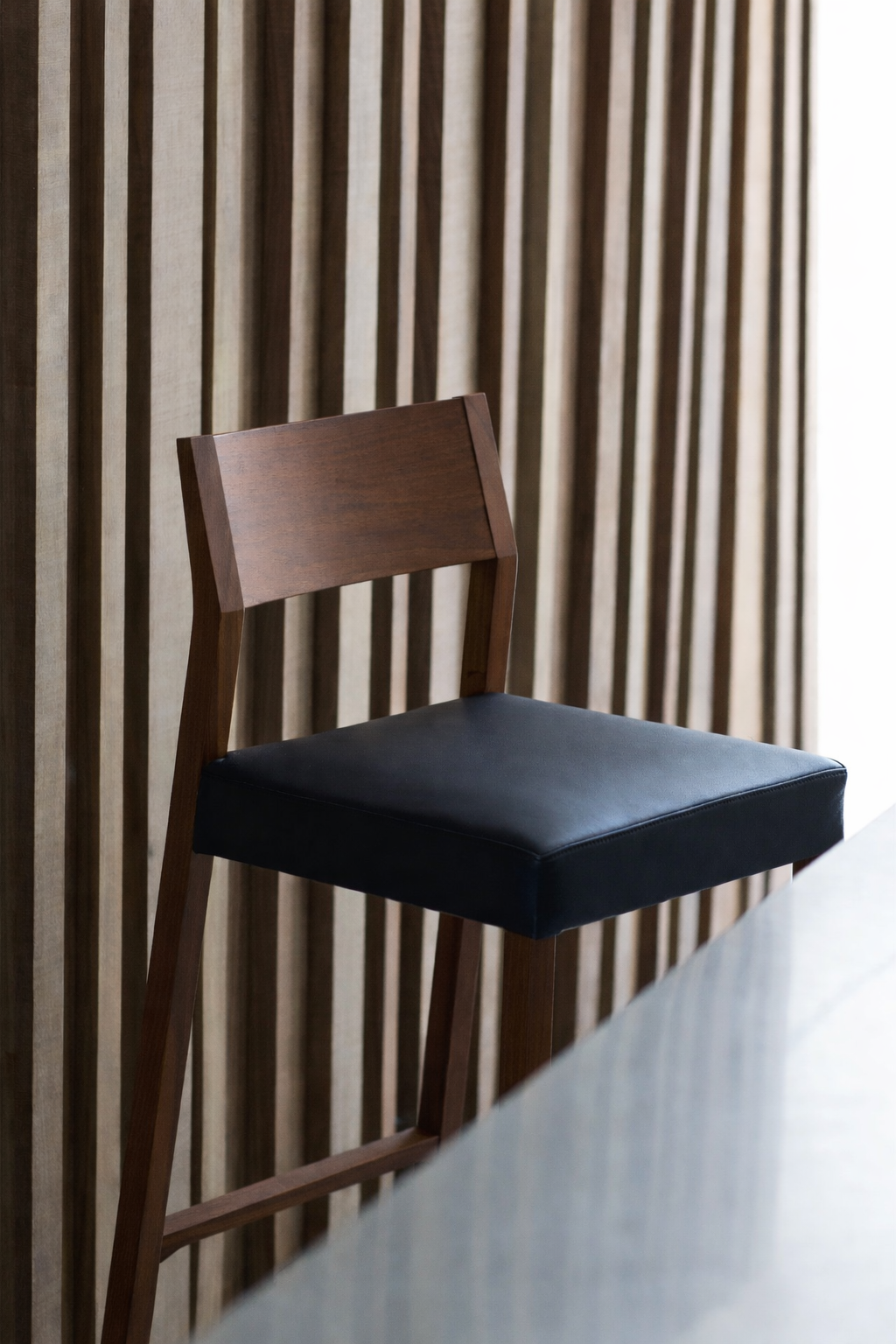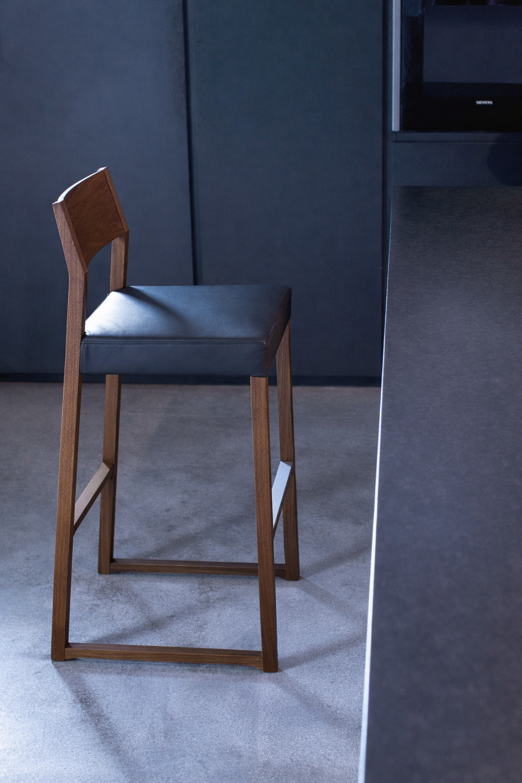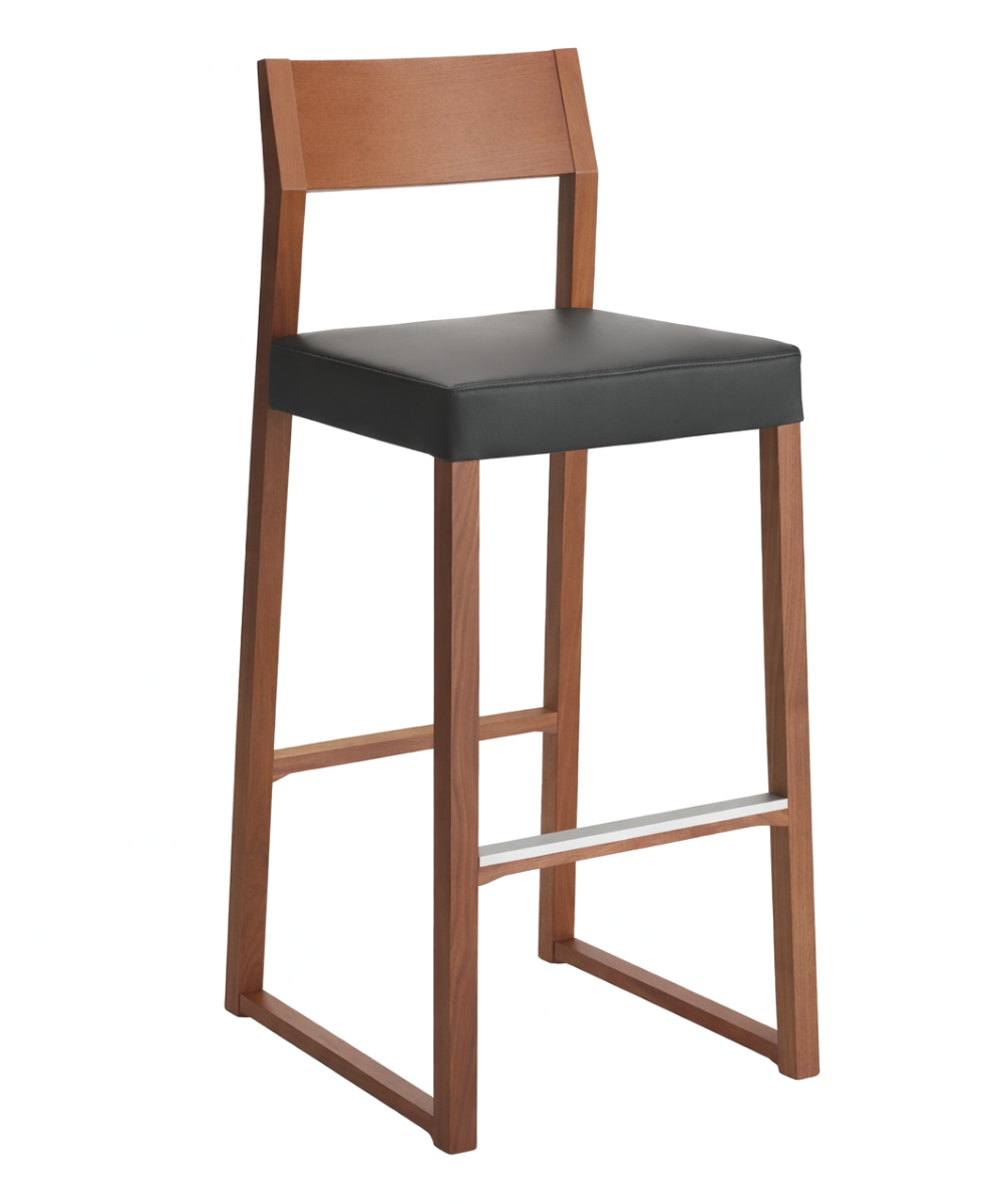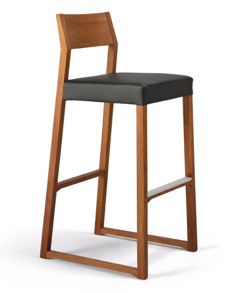 Sgabello con struttura realizzata in legno massello di faggio o di rovere. Il rivestimento del sedile è realizzato con le cinghie elastiche per offrire il massimo comfort. Poggiapiedi in alluminio satinato.