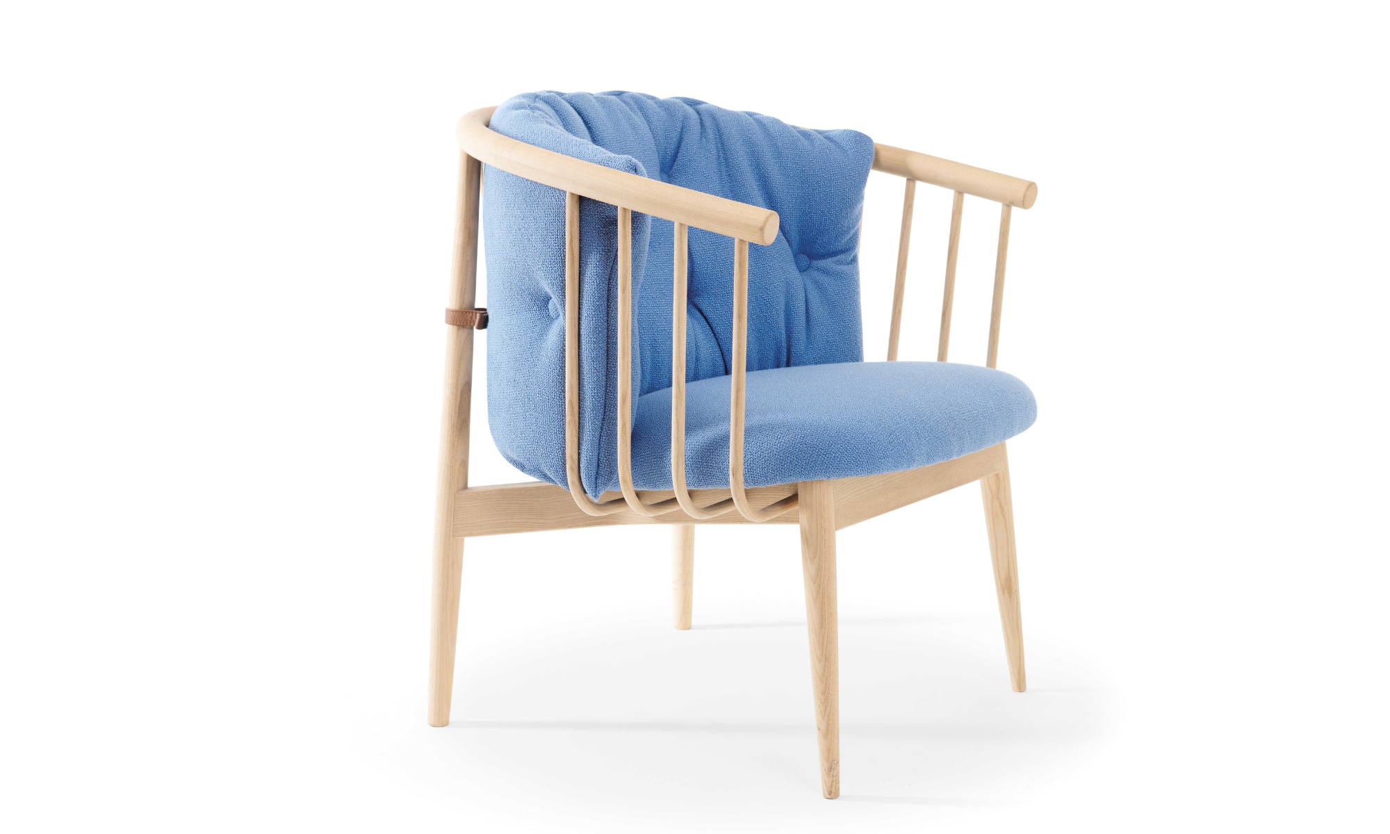Poltrona lounge realizzata in legno massello di frassino, mentre la seduta e lo schienale sono rivestiti in un'ampia gamma di materiali. I lacci che fissano lo schienale alla struttura sono in pelle.